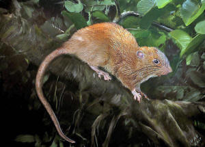 The orange-brown rat dines on nuts and fruit, has short ears, a